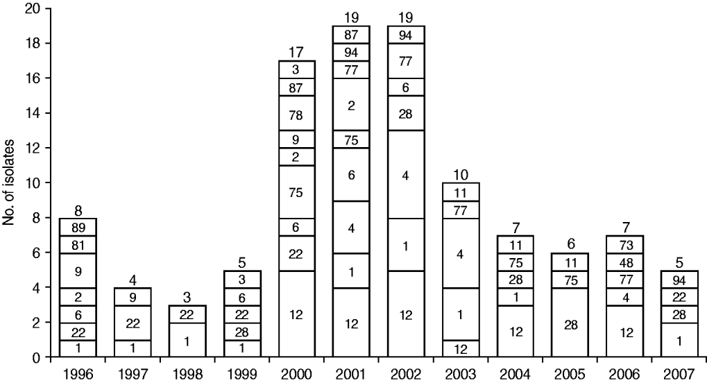 Fig. 1. Temporal distribution of emm types in the group A streptococcus population. The number of isolates from each year is shown above each bar and the corresponding emm types are shown inside bars.