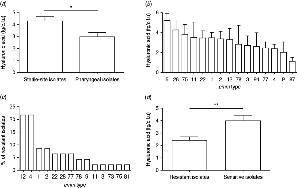 Fig. 2. Hyaluronic acid (HA) content, emm type and erythromycin resistance of 110 group A streptococcus clinical isolates. HA content (fg/c.f.u) of (a) pharyngeal and sterile-site isolates and (b) most prevalent emm types. (c) emm-type distribution among 46 erythromycin-resistant isolates, and (d) HA content of erythromycin-resistant and susceptible isolates. Data are means of two or three independent experiments and bars represent the standard error (Student's t test: * P<0·05, ** P<0·005).