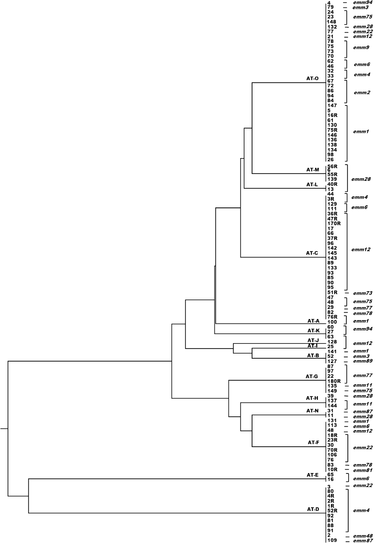 Fig. 3. Dendrogram from UPGMA cluster analysis of the csrR gene sequence of 110 group A streptococcus isolates showing allele type (AT) and emm type.