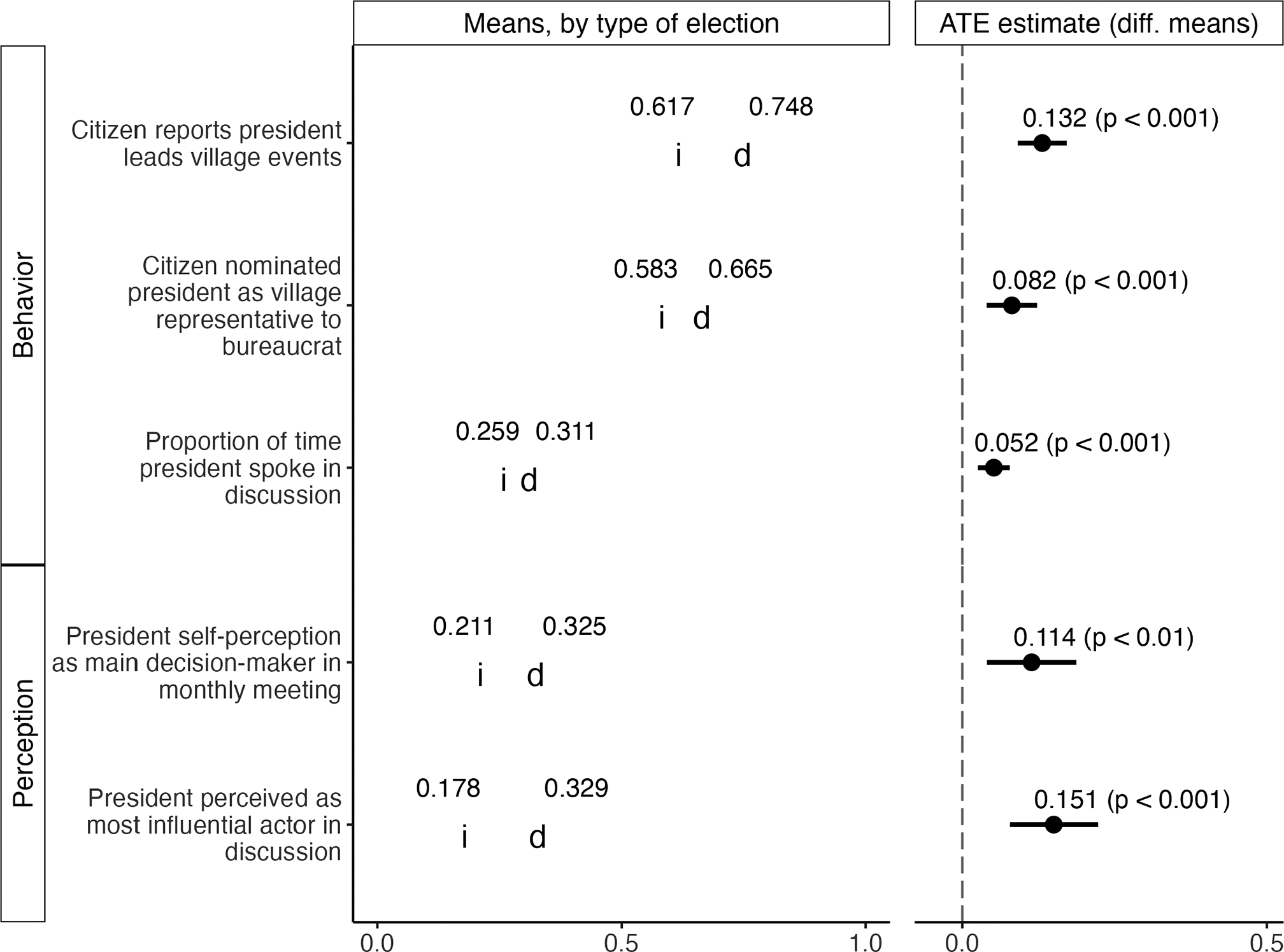 Note: Means for direct (d) and indirect (i) presidents on the left panel, and ATE estimates with 95% confidence intervals on the right panel (p-values in parentheses); citizen outcomes use clustered SEs at the village council level.