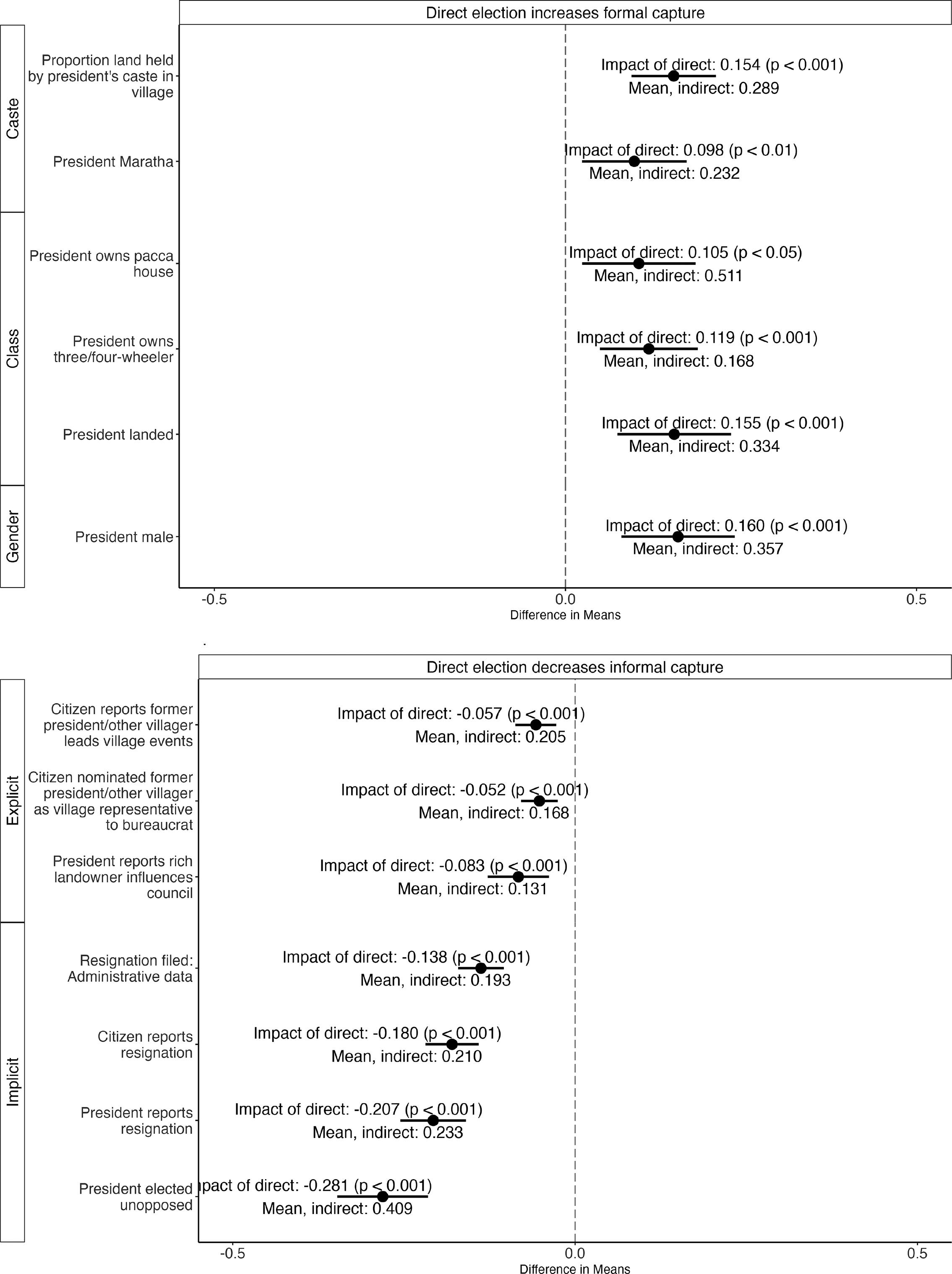 Results. Direct elections increase the formal capture of the president position. The top panel of Figure 5 presents estimates of the average treatment effect of direct elections on presidents’ characteristics. Whereas indirect presidents come from relatively less dominant caste, class, and gender backgrounds—evidence in line with the informal control via proxy hypothesis—directly elected presidents are strikingly more likely to share the demographic characteristics of the local elite, enjoying social privilege along caste, class, and gender lines. On average, they are more likely to: have a larger proportion of land belonging to their caste in the village (15.4 percentage points more land than indirect presidents); belong to Maharashtra’s dominant caste, the Marathas (+9.8 p.p.); own a pacca house (+10.5 p.p.); own a large vehicle (+11.9 p.p.); own land (+15.5 p.p.); and be a man (+16 p.p.). Here, caste and gender measure the self-reported caste and gender of the president, not the president seat’s reservation status, which is balanced across direct and indirect villages (Figure 3).Footnote 36