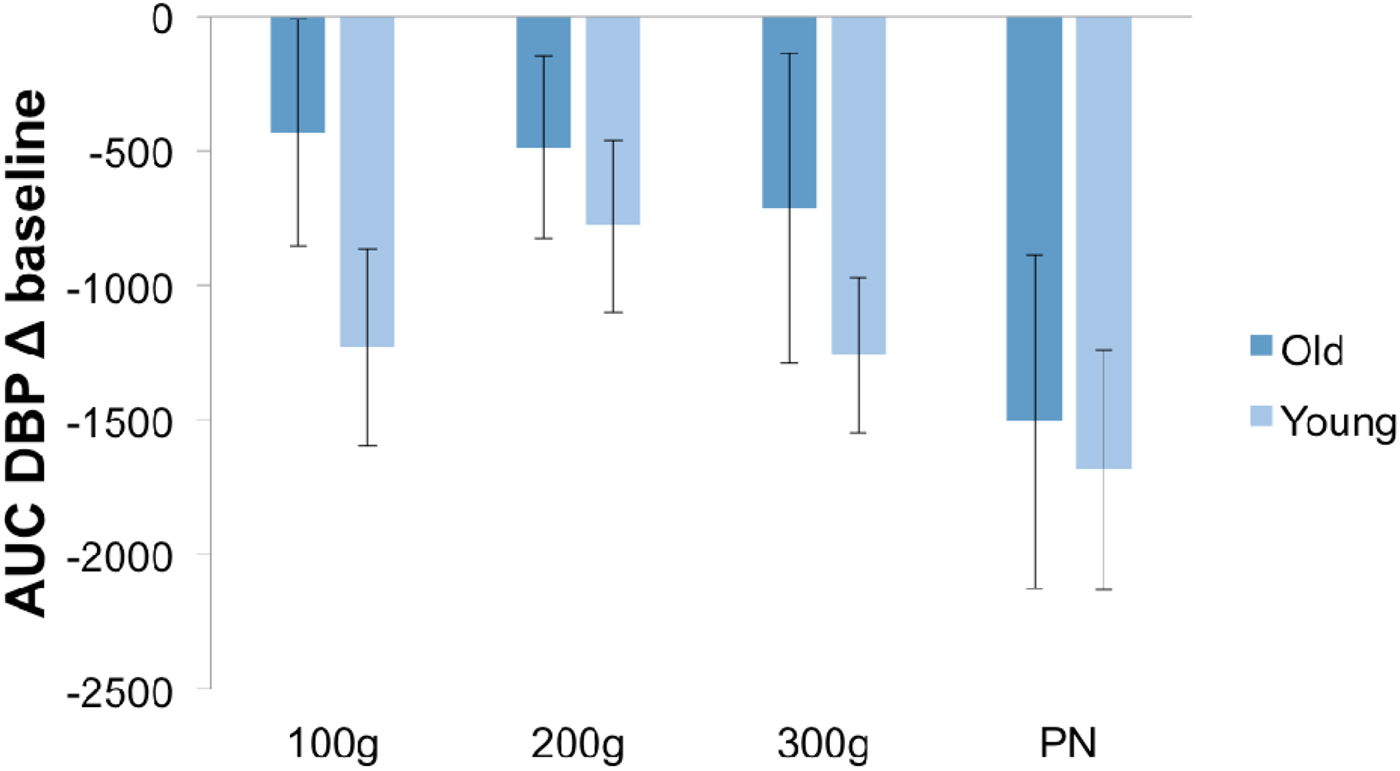 Fig. 1. Area under the curve (AUC) of change in diastolic blood pressure (DBP) from baseline in the young and old groups. Data presented as mean ± SEM, n = 24 (12 young and 12 old).
