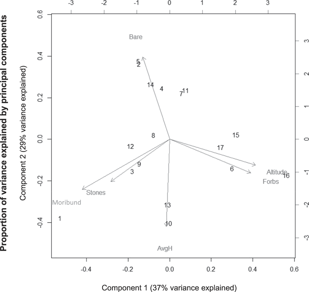 Figure 2. Analysis of lark habitat use at the territory scale using a principal component analysis. Input variables consisted of bare ground cover (“Bare”), forb cover (“Forbs”), stone cover (“Stones”) and moribund vegetation cover (“Moribund”), as well as average grass height (“AvgH”) and altitude. Numerical values on the graph represent individual Rudd’s Lark territories. The first principal component (“Component 1”; x-axis) explained 37% of the variance, while the second principal component (“Component 2”; y-axis) explained 29% of the variance.