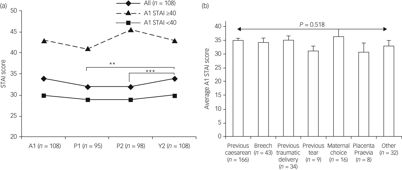 Results in bold are significant. A1, completed questionnaires at recruitment just prior to the birth; STAI, State-Trait Anxiety Inventory.