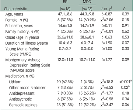 Table 1 summarises the demographic characteristics of the participants in the study. There were no significant differences in age, gender, or years of education between groups. Patients with bipolar disorder and MDD showed no significant differences in the age at onset or psychiatric scores on YMRS. Patients with bipolar disorder tended to have a longer duration of illness, and based on the MADRS score, patients with MDD tended to be more depressed than those with bipolar disorder, although these differences were not significant. All patients with bipolar disorder were on lithium and/or other mood stabilisers during the study, whereas only three individuals with MDD were medicated with these drugs. There was no significant difference in medication with antidepressants, antipsychotics, and benzodiazepine drugs between the bipolar disorder and MDD groups.