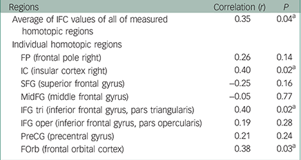| Average of IFC values of all of measured homotopic regions | 0.35 | 0.04 a |