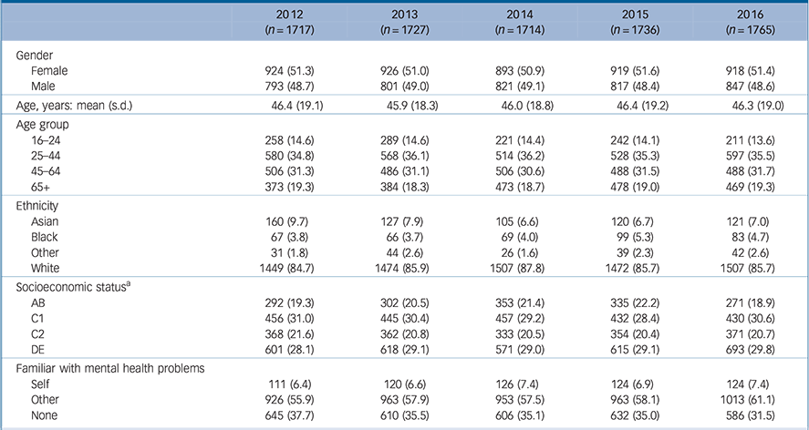The Attitudes to Mental Illness survey is conducted by the agency Kantar TNS as part of an Omnibus Survey and has been carried out annually since 2008 as a part of the TTC evaluation. The area for its sampling frame is the same as the area covered by TTC, i.e. England. TTC received funding in October 2007, and the first events were run in October 2008, coinciding with World Mental Health Day. Nationally representative separate samples of approximately 1700 adults residing in England were surveyed each year from 2008 to 2016. Reference Henderson, Robinson, Evans-Lacko, Corker, Rebollo-Mesa and Rose19 From 2012 the survey has included questions to establish awareness of TTC, Reference Henderson, Evans-Lacko and Thornicroft3 therefore this paper reports results from data collected 2012–2016. The survey is carried out using a quota sample, with locations for interviewing selected using a random methodology. Information from the UK Census and postal code areas were used to define interviewing locations, which were stratified by regions of England as defined by the UK Government Office, and social status.