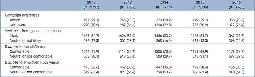 Table 2 Responses to Time to Change campaign awareness, and mental illness help-seeking and disclosure by year, unweighted frequency and weighted percentages