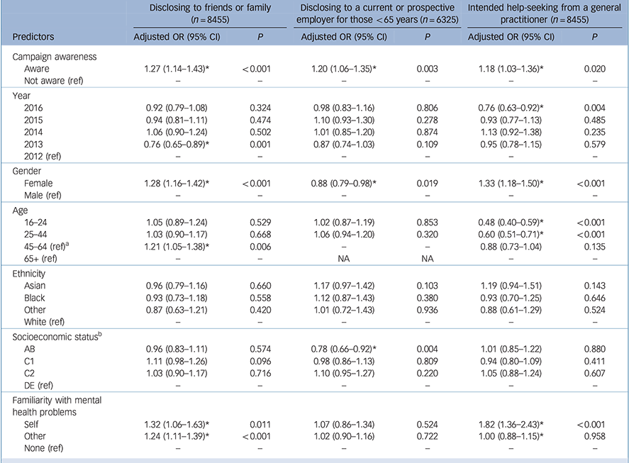 Campaign awareness was the only independent variable significantly associated with the dependent variable for all three adjusted models. Survey year 2016 was significantly associated with lower intentions to seek help from a GP as compared with the reference year 2012 (OR = 0.76, 95% CI 0.63–0.92); 2013 was significantly associated with less comfort in disclosing to friends or family (OR = 0.76, 95% CI 0.65–0.89); and no survey year was associated with predicted comfort in disclosing to an employer. Female gender was associated with reduced comfort regarding disclosure to an employer (OR = 0.88, 95% CI 0.79–0.98) but significantly positively associated with intentions to seek help from a GP (OR=1.33, 95% CI 1.18–1.50) and to disclose to friends or family (OR = 1.28, 95% CI 1.16–1.42). Being aged 16–44 was significantly associated with lower intentions to seek help from a GP compared with being aged 65 or over (OR for 16–24 = 0.48, 95% CI 0.40–0.59; OR for 25–44 = 0.60, 95% CI 0.51–0.71); being 45–64 was significantly associated with feeling comfortable disclosing to family or friends compared with older and younger age groups (OR = 1.21, 95% CI 1.05–1.38).