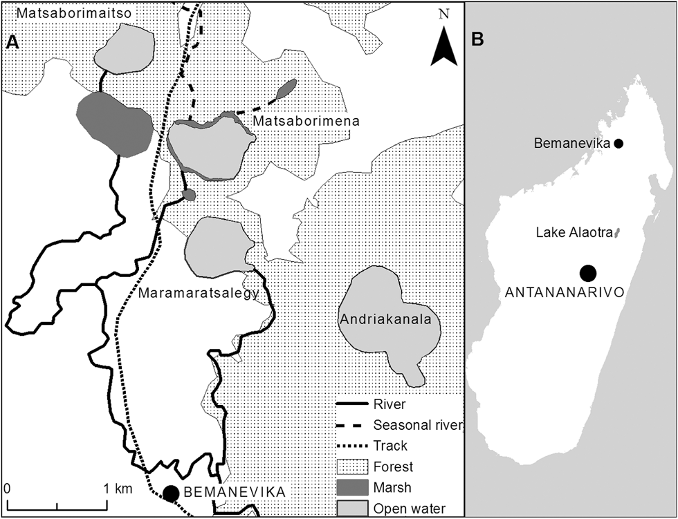 Figure 1. A) Map of the four lakes at the Madagascar Pochard site near Bemanevika, B) Location of Bemanevika and Lake Alaotra.