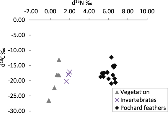 Sixteen feathers were collected as well as three invertebrate samples (two Trichoptera and one Chironomidae) and five vegetation samples (two samples of submerged macrophytes from Andriakanala, one of emergent Eleocharis and two of filamentous algae from Matsaborimena). Potential food items were sampled from both Matsaborimena and Andriakanala as moulting individuals were observed on both lakes. Pochard feathers displayed a narrow range of 15N content, with a mean of 6.1 ± 0.5‰ (Fig. 5). The invertebrate samples had a mean 15N of 1.84‰ and the plants of 0.54‰.