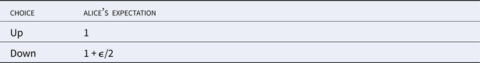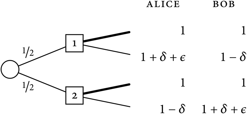 Here, the square represents a choice node, where we have a choice between going up or going down. If we go up, Alice gets a well-being of 1. If we go down, we reach a chance node, represented by the circle, where there is a one-in-two probability that chance goes up and a one-in-two probability that chance goes down. If chance goes up, Alice gets a well-being of 1 + δ + ε. And, if chance goes down, she gets a well-being of 1 − δ.