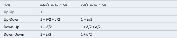 But this proposal does not avoid violations of the Weak Sequential Ex-Ante Pareto Principle. To see this, consider Case Two. Suppose that Alice is the agent at node 1 and that it would be her first choice node. And suppose that Bob is the agent at node 2 and that it would be his first choice node.Footnote 19 Then, given Agent-Relative Resolute Ex-Ante Prioritarianism, Alice would make the choice at node 1 based on evaluations of the options calculated at that node; and Bob would make the choice at node 2 based on evaluations of the options calculated at that node. Accordingly, Agent-Relative Resolute Ex-Ante Prioritarianism prescribes that Alice goes up at node 1 and that Bob goes up at node 2, just like standard Ex-Ante Prioritarianism. Therefore, Agent-Relative Resolute Ex-Ante Prioritarianism prescribes that Alice and Bob jointly implement the Up-Up Plan. But, as we saw earlier, the Up-Up Plan gives everyone a worse expectation than the Down-Down Plan.