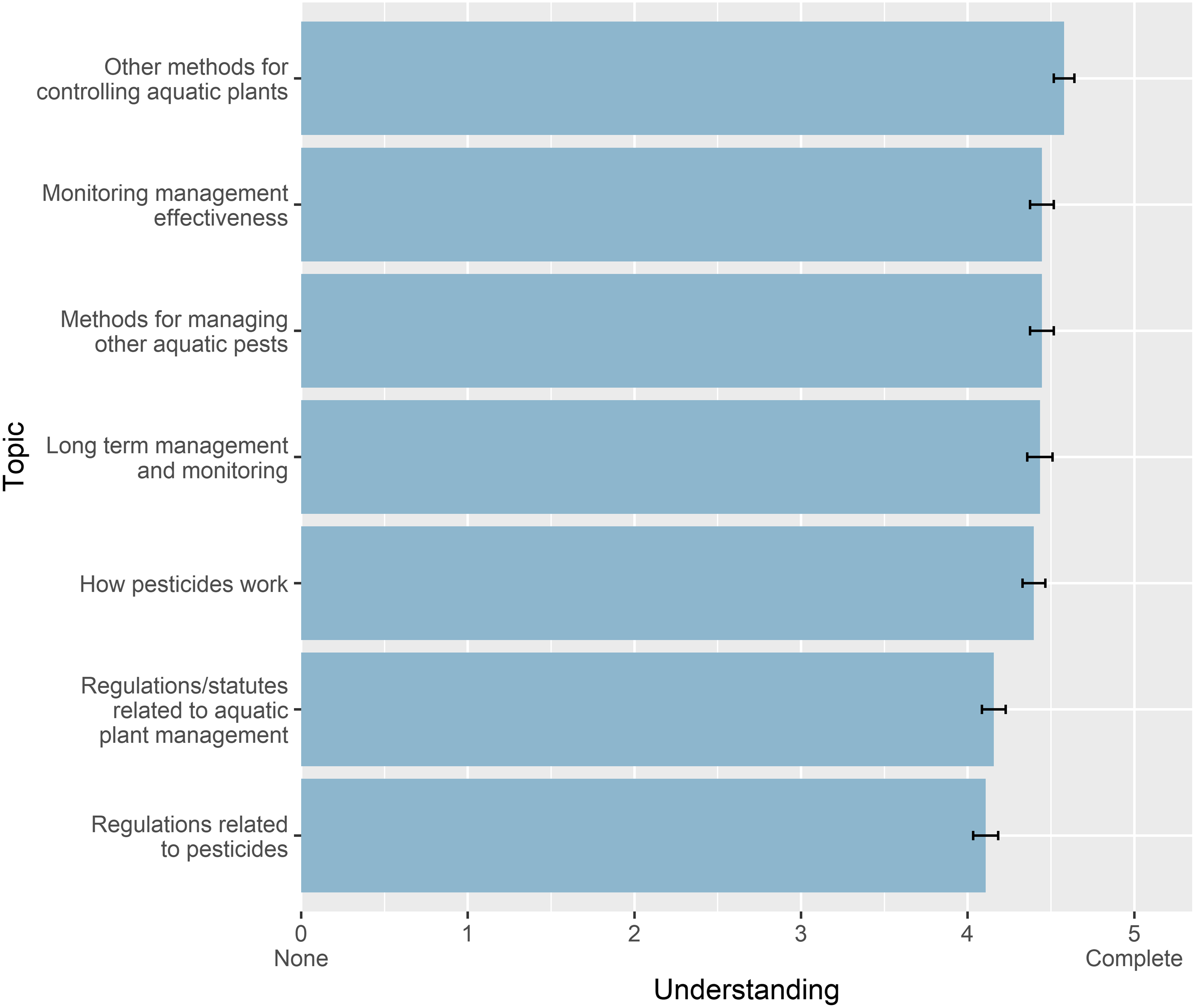 Eighty-three of the 112 participants who completed the course participated in the course evaluation, a 74% response rate. Participants indicated an overall high level of understanding of course content and satisfaction with the course. Most respondents (77%) “strongly agreed” that they felt more knowledgeable about AIS management. Participants were asked to indicate their levels of understanding of seven key concepts from the course (regulations and statutes related to aquatic plant management, methods for managing other aquatic pests, how pesticides work, regulations related to pesticides, other methods of controlling aquatic plants, monitoring management effectiveness, long-term management and monitoring). Mean ratings for these concepts were high, ranging from 4.1 to 4.4 (with a value of 5 indicating “complete understanding”; Figure 2).