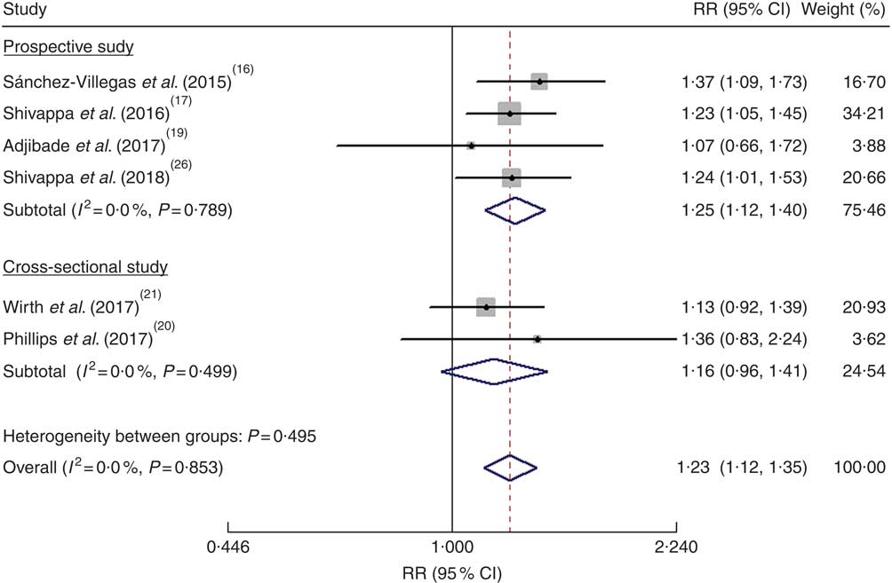 As shown in Fig. 2, the pooled RR was 1·23 (95 % CI 1·12, 1·35) for the highest v. the lowest DII score in a fixed-effects model, with no evidence of heterogeneity (I 2=0·0 %, P=0·853). Sensitivity analysis indicated that no single study affected the pooled risk estimate significantly. When stratified by study design, the pooled RR was 1·25 (95 % CI 1·12, 1·40) for the prospective cohort studies(Reference Sánchez-Villegas, Ruiz-Canela and de la Fuente-Arrillaga16, Reference Shivappa, Schoenaker and Hebert17, Reference Adjibade, Andreeva and Lemogne19, Reference Shivappa, Hebert and Veronese26) and 1·16 (95 % CI 0·96, 1·41) for the cross-sectional studies(Reference Phillips, Shivappa and Hebert20, Reference Wirth, Shivappa and Burch21). Publication bias was not found according to Begg’s test (P=0·452) and Egger’s test (P=0·994).