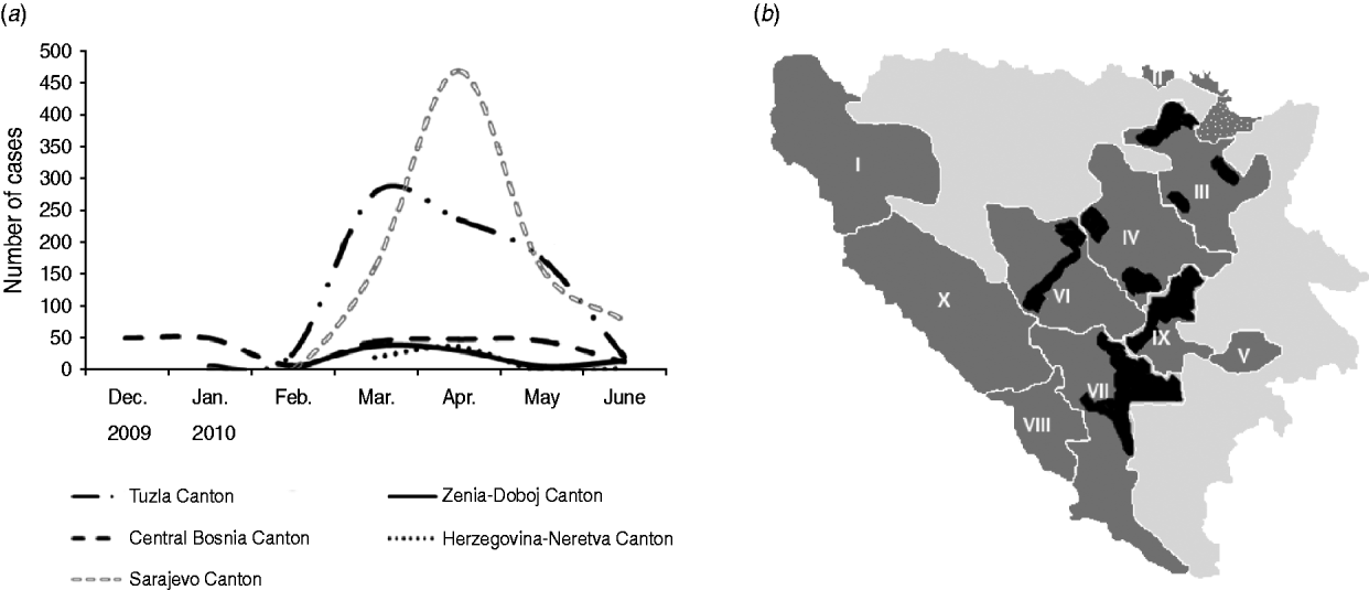 Fig. 1. (a) Number of cases in relation to time for the five cantons affected by the outbreak. (b) Map of the Federation of Bosnia and Herzegovina showing the geographical distribution of rubella cases notified between 16 December 2009 and 31 May 2010 (black-coloured areas). I, Una-Sana Canton; II, Posavina Canton; III, Tuzla Canton; IV, Zenica-Doboj Canton; V, Bosnian Podrinje Canton; VI, Central Bosnia Canton; VII, Herzegovina-Neretva Canton; VIII, West Herzegovina Canton; IX, Sarajevo Canton; X, West Bosnia Canton. The Republic of Srpska entity is coloured light grey and Brčko District in grey with white dots (top right).