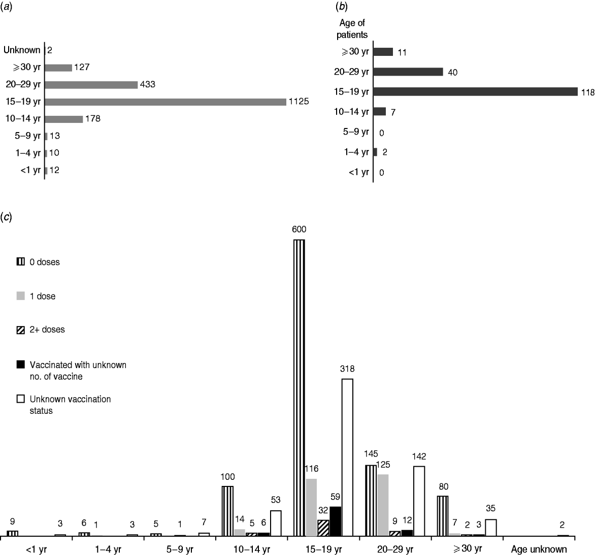 Fig. 2. Age status of (a) all and (b) laboratory-confirmed patients involved in the rubella outbreak from 16 December 2009 to 31 May 2010 in the Federation of Bosnia and Herzegovina. (c) Vaccination status of all rubella cases in relation to age group.