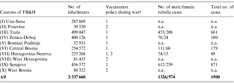 Table 1. Number of inhabitantsFootnote *, vaccination policy during the war (1992–1995), number of male and female rubella cases, and total case numbers in each of the cantons of the Federation of Bosnia and Herzegovina (FB&H)