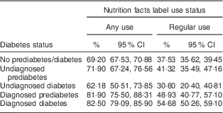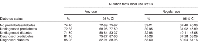 Table 2 reports nutrition facts label use by diabetes diagnosis status. The population-weighted prevalence of any nutrition facts label use was substantially higher among those with diagnosed prediabetes (81·90 %) and diabetes (82·50 %) in comparison to those with undiagnosed prediabetes (71·90 %) and diabetes (62·18 %). Analogously, the population-weighted prevalence of regular nutrition facts label use was substantially higher among those with diagnosed prediabetes (48·93 %) and diabetes (54·68 %) in comparison to those with undiagnosed prediabetes (41·32 %) and diabetes (30·60 %).
