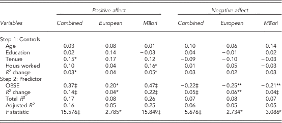 Towards positive affectivity, OBSE is significant in all samples: combined (β=.37, p<.001), European (β=0.20, p<.05), and Māori (β=0.47, p<.001). From the R 2 change figures in Step 2, it can be seen that OBSE accounts for 14% of the total variance (p<.001) for positive affectivity in the combined sample, only 4% (p<.05) in the European sample, and a much larger 22% (p<.001) in the Māori sample. Similarly, OBSE is significantly associated with negative affectivity in all samples: combined (β=−0.22, p<.001), European (β=−0.25, p<.01), and Māori (β=−0.21, p<.01). From the R 2 change figures in Step 2, it can be seen that OBSE accounts for a small 5% of the total variance (p<.001) for negative affect in the combined sample, with similar results for both the European (6%, p<.01) and Māori samples (4%, p<.001). Overall, there is support for OBSE influencing affectivity outcomes, supporting Hypotheses 4 and 5.