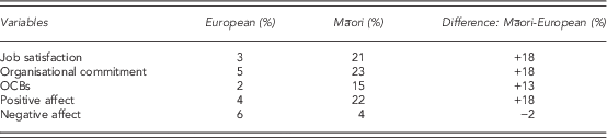 Table 4 shows that there are significant within-country differences between and within the present samples. The influence of OBSE on job outcomes was shown to be greater for Māori employees than for Europeans (an additional 13–18%), as was its influence on positive affect (an additional 18%). The only difference in strength for European employees is towards negative affect and the difference is minor (an additional 2%). Overall, we argue these findings provide support for significant within-country differences in the expected direction, with Māori reporting higher influence from OBSE.