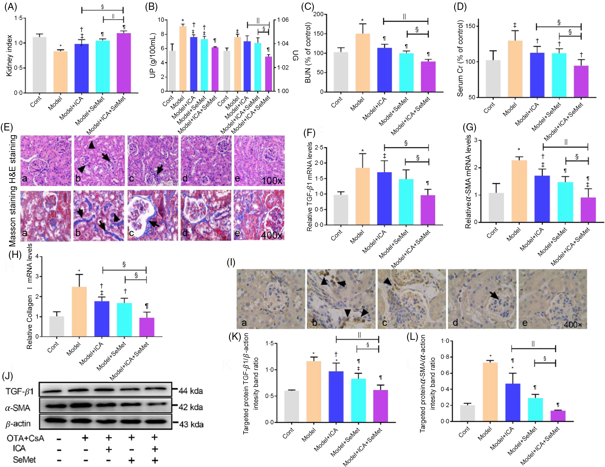 Fig. 1. Protective effects of icariin (ICA) or/and selenomethionine (SeMet) on renal function and fibrosis in chronic tubulointerstitial nephropathy (CTIN) model mice. Kidney index (A), urine protein (UP), urine gravity (UG) (B), Serum blood urea nitrogen (BUN) (C) and serum creatinine (Scr) (D) were assayed. Haematoxylin–eosin (H&E) (E, 100×), Masson staining (E, 400×), transforming growth factor-beta 1 (TGF-β1) (F, J, K), α-smooth muscle actin (α-SMA) (G, J, L) and collagen I (H) mRNA and protein levels were detected as described in the Materials and Methods (a: control; b: model; c: model + ICA; d: model + SeMet; e: model + ICA + SeMet). Immunohistochemical staining of α-SMA (I) was observed. Data were presented as means and standard deviations (n 6 or n 3). Compared with control group, ‡ P < 0·05 was considered statistically significant and * P < 0·01 was considered strongly significant. Compared with model group, † P < 0·05 was considered statistically significant and ¶ P < 0·01 was considered strongly significant. Compared with model + ICA + SeMet group, § P < 0·05 was considered statistically significant and || P < 0·01 was considered strongly significant.