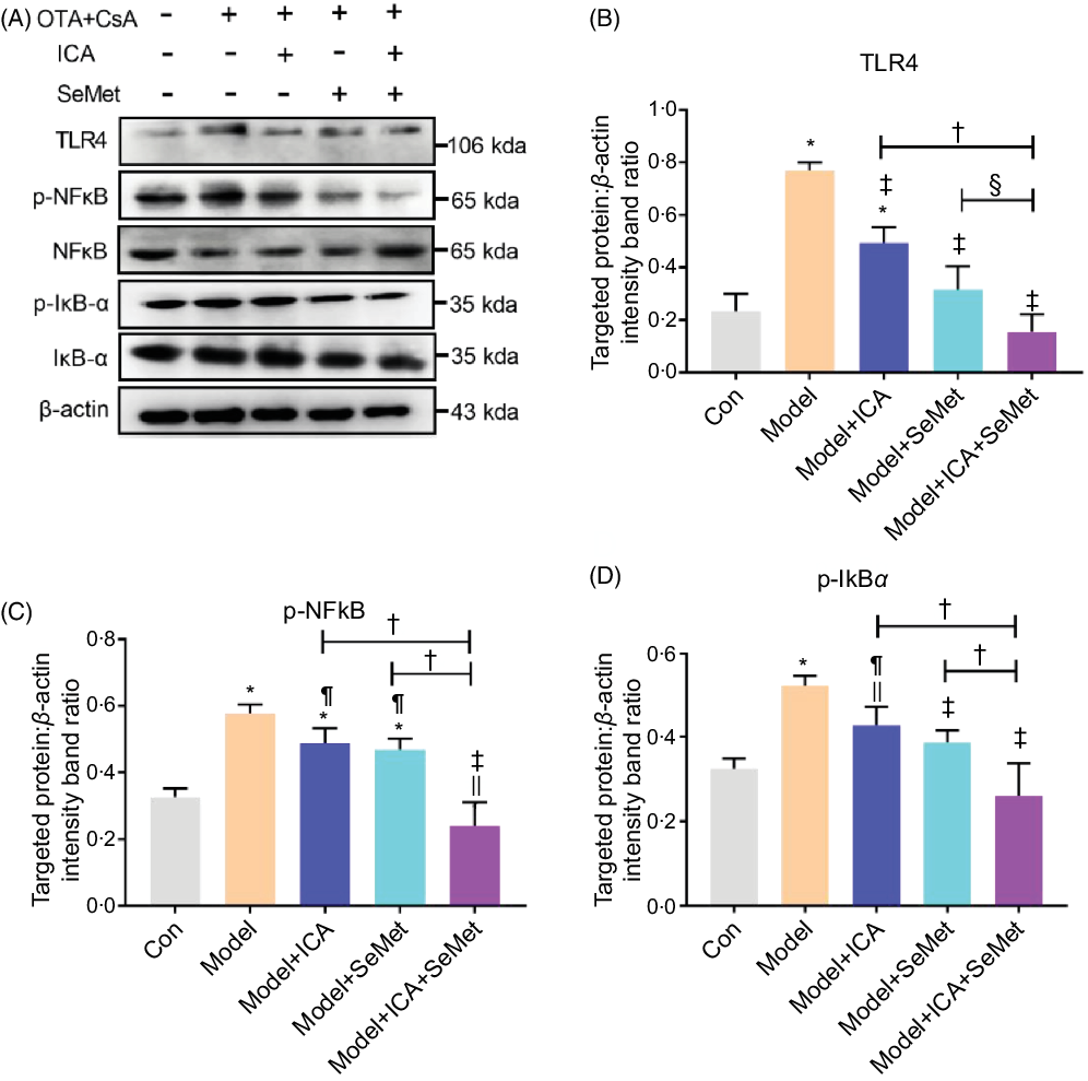 NFκB, as a downstream protein of TLR4, would be phosphorylated and transported into cell nucleus when it was activated. IκBα would also be phosphorylated and then degraded. Protein expressions of TLR4, p-NFκB and p-IκBα were significantly up-regulated in the CTIN model mice (Fig. 2). To investigate the effects of ICA or/and SeMet on expression of TLR4 and NFκB in CTIN model mice, target proteins/β-actin intensity band ratios were measured. The up-regulated expression of TLR4, p-NFκB and p-IκBα induced by CsA and OTA was significantly decreased by the treatment of ICA or/and SeMet as shown in Fig. 2B–D (P < 0·05). Treatment of ICA and SeMet in combination obviously worked better (P < 0·05). It suggested that the application of ICA and SeMet could activate TLR4/NFκB signalling pathway in CTIN model mice.