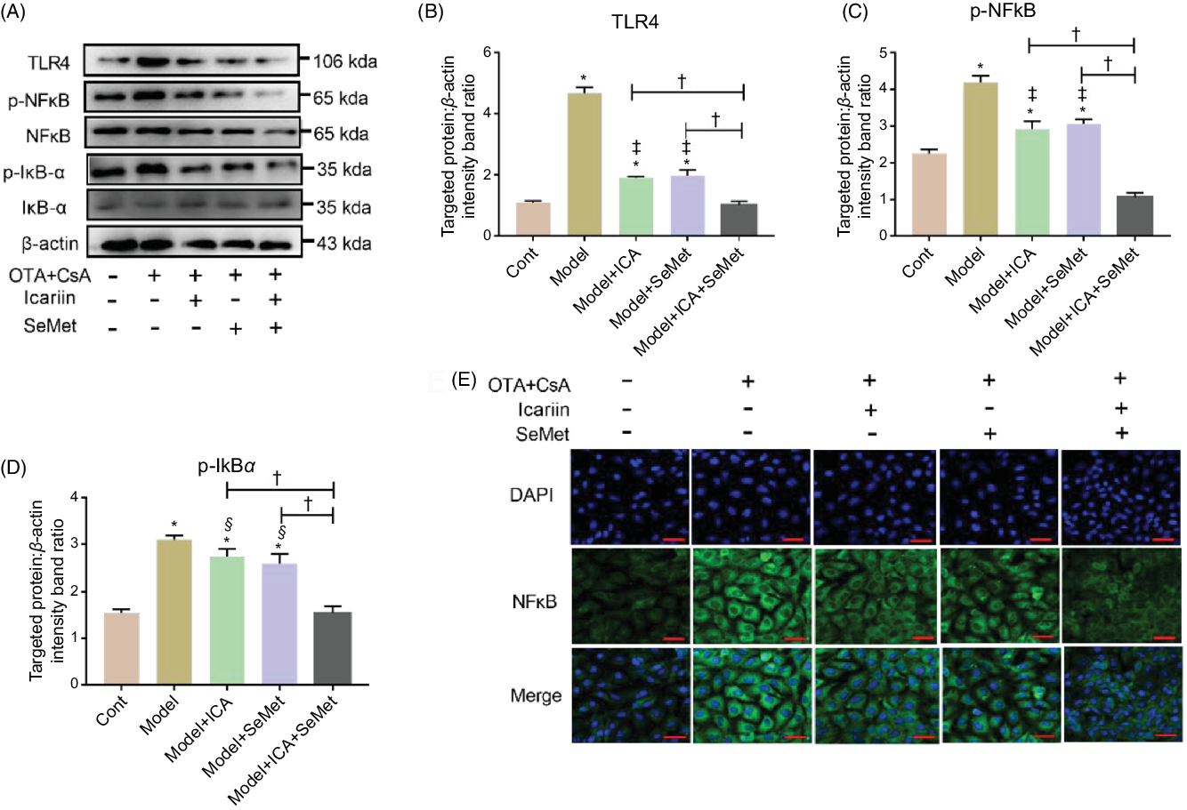In the presence of CsA and OTA in combination, HK-2 cells were incubated with ICA or/and SeMet. The protein expression of TLR4, p-NFκB and p-IκBα was measured. As shown in Fig. 4A–D, the expression of them was sharply elevated in model group (P < 0·01). Supplement with ICA or/and SeMet significantly lessened the uptrend expression of TLR4, p-NFκB and p-IκBα. The combination of ICA and SeMet was more effective. In addition, the location of NFκB was detected and it was transported into the nucleus in the model group, while ICA and SeMet inhibited the NFκB activation and its transportation to the nucleus (Fig. 4E). Treatment of ICA and SeMet in combination obviously worked better. These results further verified that combination of ICA and SeMet could reduce the protein expression of TLR4/NFκB signalling pathway, which could play a key role in resisting the renal injury.