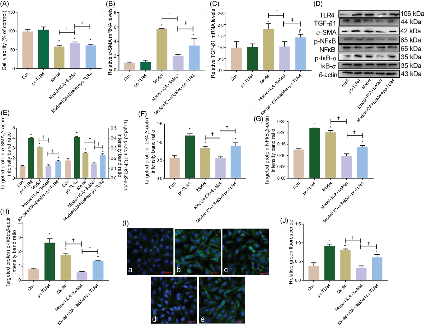 Fig. 6. Effects of toll-like receptor 4 (TLR4) overexpression on nephroprotection of icariin (ICA) and selenomethionine (SeMet) in combination in human renal proximal tubule epithelial (HK-2) cells. Cell viability (A), relative mRNA levels of α-smooth muscle actin (α-SMA) (B) and transforming growth factor-beta 1 (TGF-β1) (C), protein expression of TGF-β1, α-SMA (D, E), TLR4 (D, F), p-NFκB (D, G), p-IκBα (D, H) and NFκB foci (I, J) were assessed (a: control; b: pc-TLR4; c: model; d: model + ICA + SeMet; e: model + ICA + SeMet + pc-TLR4). Data were presented as means and standard deviations (n 6 or n 3). Compared with control group, § P < 0·05 was considered statistically significant and * P < 0·01 was considered strongly significant. ‡ P < 0·05 was considered statistically significant, and † P < 0·01 was considered strongly significant.