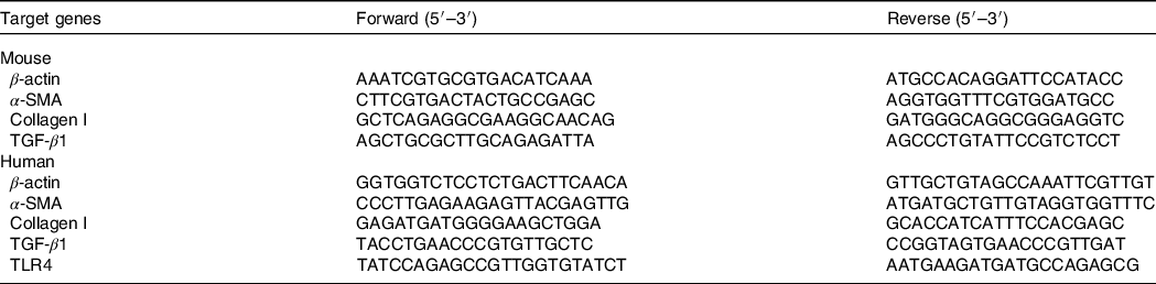 The total protein was extracted, and their concentrations were measured by BCA protein assay kits (Beyotime). Forty micrograms of protein was denatured in loading buffer and heated at 95°C for 5 min. By using 12 % SDS-PAGE assay, the protein was transferred to polyvinylidene difluoride membranes. The membranes were incubated with specific primary antibodies including anti-α-smooth muscle actin (α-SMA) (Bioss), anti-TGF-β1 (ABclone), anti-TLR4, anti-IκBα, anti-p-IκBα (Santa), anti-NFκB anti-p-NFκB and anti-β-actin (CST) at 4°C overnight. The polyvinylidene difluoride membranes were washed with TRIS-buffered saline three times and then incubated with HRP-labelled anti-rabbit secondary antibody. Blots were visualised and analysed by a Luminescent Image Analyzer (FUJIFILM 171 LAS-4000). The results were expressed as percentage with respect to the control group.
