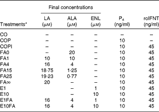 LA, linoleic acid (n-6); ALA, α-linolenic acid (n-3); ENL, enterolactone; P4, progesterone; roIFNT, recombinant ovine interferon-τ; CO, control cells with no hormones; COP, control cells treated with P4; COPI, control cells treated with progesterone and roIFNT; FA, fatty acids; FA0, LA:ALA ratio of 0; FA1, LA:ALA ratio of 1; FA4, LA:ALA ratio of 4; FA15, LA:ALA ratio of 15; FA25, LA:ALA ratio of 25; FA∞, LA:ALA ratio of ∞; E1, ENL 1; E10, ENL 10; E1FA, ENL 1+FA4; E10FA, ENL 10+FA4.