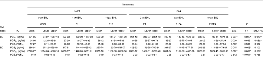 Table 4 Effects of enterolactone (ENL), alone or in combination with a linoleic acid (LA):α-linolenic acid (ALA) ratio of 4:1, on PGE2 and PGF2α synthesis in endometrial stromal (SC) and epithelial (EC) cells‡ (Mean values and lower and upper values)