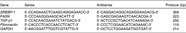 Table 1 Primers and produce for sterol regulatory element binding protein-1 (SREBP-1), fatty acid synthase (FASN), transforming growth factor-β1 (TGF-β1), fibronectin and glyceraldehyde-3-phosphate dehydrogenase (GAPDH)