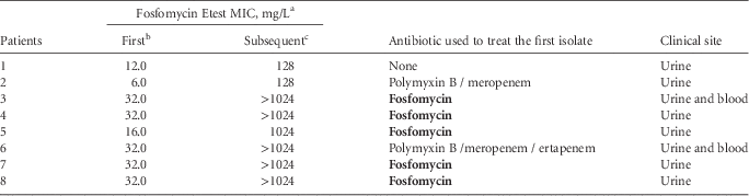 TABLE 1 Microbiologic Features and Patients’ Data in Study of Emergence of Fosfomycin Resistance