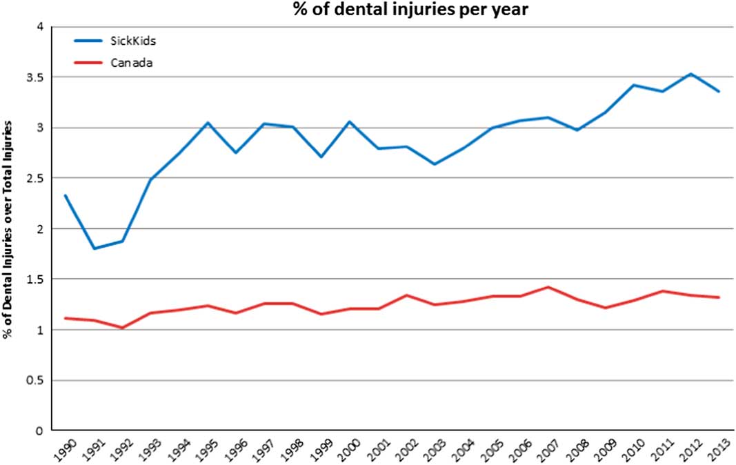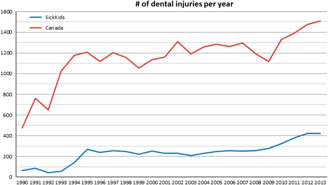 In Canada, there is a unique opportunity for studying the clinical characteristics of injuries in children through the Canadian Hospitals Injury Reporting and Prevention Program (CHIRPP), which monitors injury patterns in patients aged 0–18 years. Fifteen hospitals situated across the country participate in the CHIRPP injury surveillance program, which thereby helps to describe national injury patterns. Some dental injury patterns are particularly common in Canadian children, e.g., those related to widespread participation in ice hockey and baseball, 5 and Canadian legislation has implemented some, mostly voluntary, strategies for injury prevention.Reference Fuselli and Yanchar 6 , 7 The aim of this study was to examine changing patterns in the incidence and etiology of dental injuries in Canadian patients between 0 and 18 years of age. We also document the experience of a large tertiary care pediatric hospital to examine the use of safety equipment and describe the dental injuries.