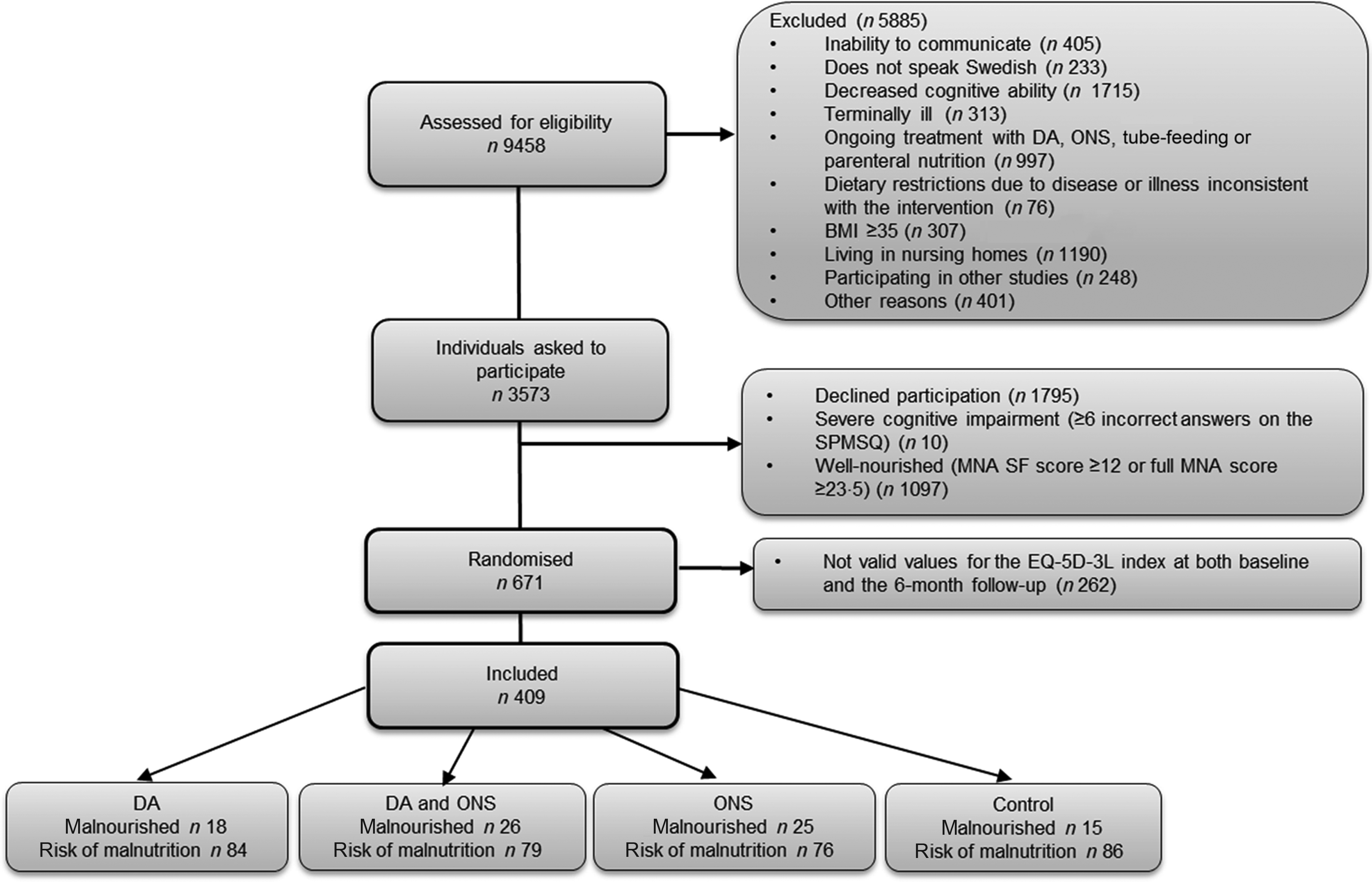 Fig. 1. Flow chart describing the participant recruitment and randomisation process in five hospitals in central Sweden. DA, dietary advice; MNA, Mini Nutritional Assessment; ONS, oral nutritional supplements; SPMSQ, Short Portable Mental Status Questionnaire; EQ-5D-3L, European quality of life five-dimension, three-level.