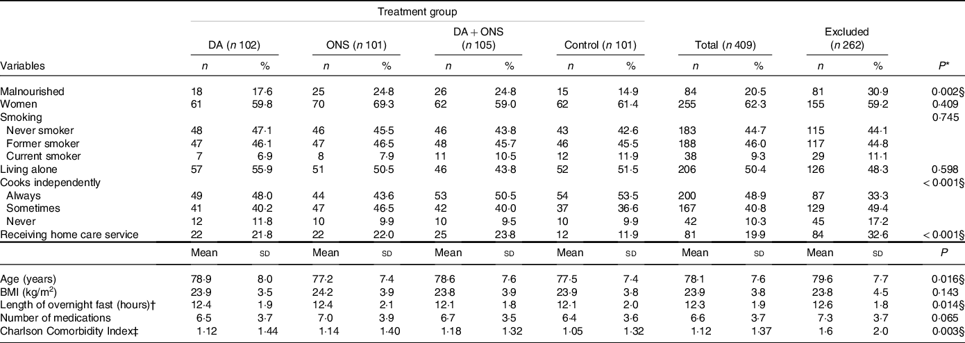 Table 1 also gives baseline characteristics for the 262 individuals excluded from the study. Compared with the individuals included in the study, the excluded individuals seemed to me more fragile in that they were more often malnourished (P = 0·002), less often cooked independently (P < 0·001), more often received home care service (P < 0·001), were somewhat older (mean age 79·6 years, P = 0·016), had a longer overnight fast (12·6 h, P = 0·014) and had a higher degree of co-morbidity (mean Charlson Comorbidity Index 1·65 v. 1·12, P = 0·003). No statistically significant differences between the two groups were, however, found regarding sex, smoking, living alone, BMI and number of medications used.