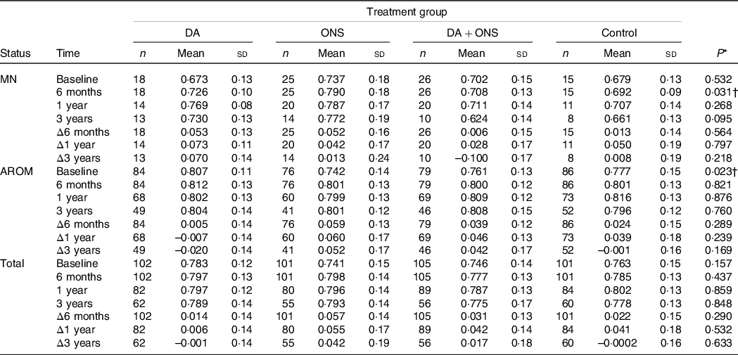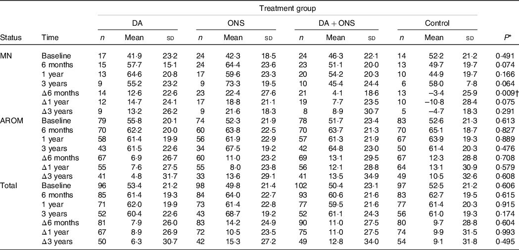 ‡ 23 (27·4 %), 144 (44·3 %) and 167 (40·8 %) observations with complete data for the MN, AROM and total, respectively, groups.