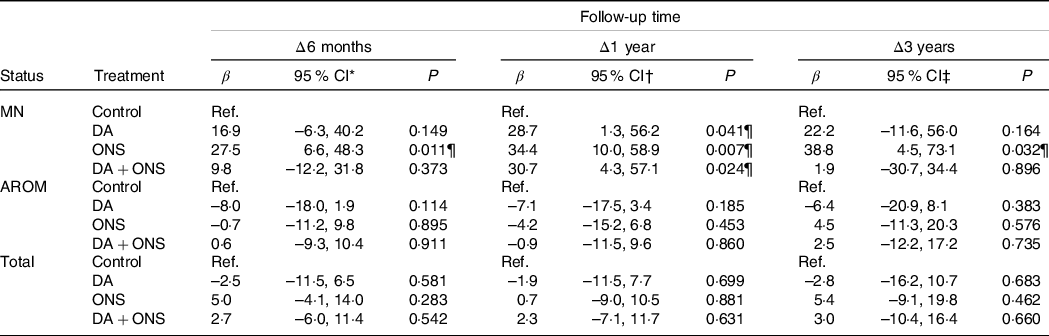 Table 4. Results of multiple linear regression analyses of changes Δ in visual analogue scale (VAS) scores from baseline to follow-up using treatment group as predictor, for the malnourished (MN) and at risk of malnutrition (AROM) nutritional status groups as well as for the total study group§