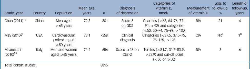 We planned the following subgroup analyses a priori: gender, age ⩾65 years, prevalence of vitamin D deficiency, proportion of participants with a disease known to affect vitamin D, and adjustment for different confounders. We planned a priori to perform a sensitivity analysis excluding studies with a high risk of bias. For the cohort studies we performed a sensitivity analysis using the cut-off point of 37.5 nmol/l compared with 75 nmol/l for the one study that did not provide data using our standard cut-off point of 50 nmol/l. We also performed a sensitivity analysis for the cross-sectional studies excluding one study that had recruited participants aged 15–39 years Reference Ganji, Milone, Cody, McCarty and Wang33 (our inclusion criteria specified adults aged 18 years).