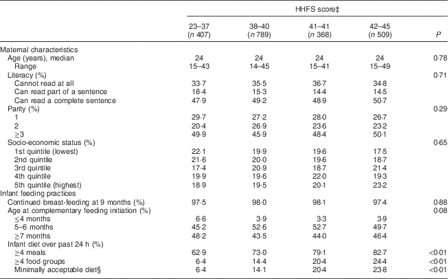 Table 2 Maternal characteristicsFootnote * and infant feeding practicesFootnote † among 2073 mother–child dyads in 2011–2012 in Kishoreganj, Bangladesh, by household food security (HHFS) score