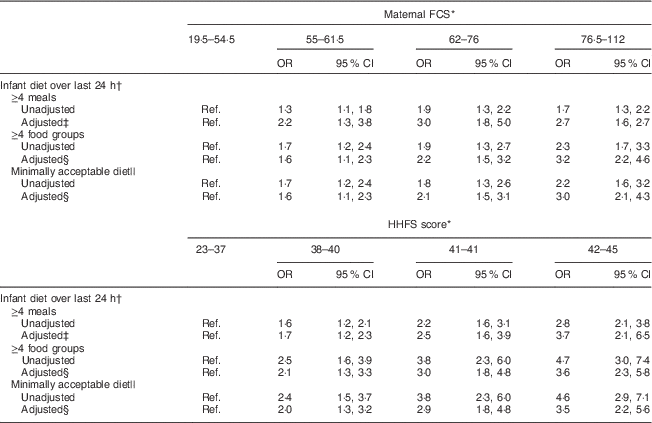Binary variables for infant dietary diversity and receipt of a minimally acceptable diet were created using WHO cut-offs( 21 ). Quartiles were created for both measures of household food security for analysis. Multivariable logistic regression, adjusted for socio-economic status, maternal age, literacy and parity and infant sex, was used to determine the association between household food security and quality of infant diet. Interactions between both measures of household food security and each of the covariates were assessed. Statistical significance was set at P<0·05.