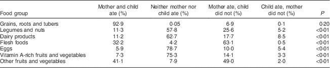 We also examined differences between the maternal and infant diets. Table 4 summarizes the comparison of maternal and infant dietary diversity. The greatest overlap occurred for grains, roots and tubers, which 93 % of mother–child dyads reported consuming over the past 24 h. The highest discrepancy between maternal and infant diets was for flesh foods, with 63 % of mothers reporting consuming meat when their infant did not, followed by non vitamin A-rich fruits and vegetables (49 %) and legumes and nuts (26 %). More than three-quarters of mother–child dyads included in the study reported not consuming eggs (78·7 %) and vitamin A-rich fruits and vegetables (75·3 %). More than half of the respondents also reported not consuming dairy products (62·7 %) and legumes and nuts (57·8 %) for both themselves and their children. We did not observe a difference between maternal and infant dietary diversity by infant sex.
