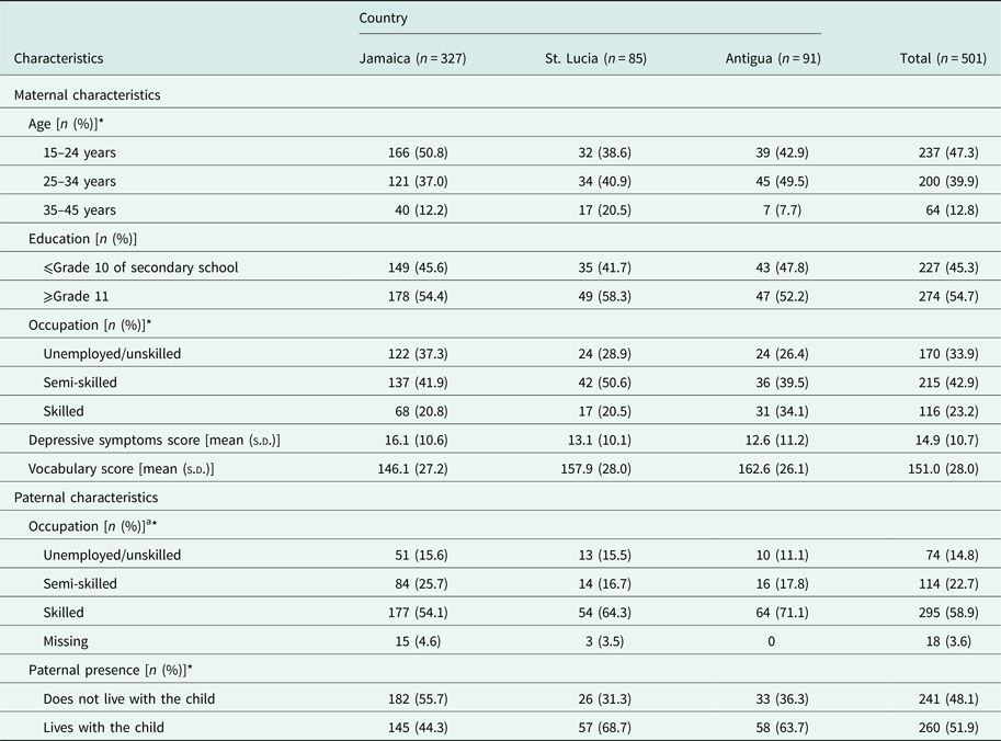 Six hundred and one mother and infant dyads were recruited at the 6–8-week postnatal visit from 39 child health centres, in Jamaica (n = 20 centres), St. Lucia (n = 9) and Antigua (n = 10) between August 2011 and March 2012. Infants were excluded if they were born very preterm (<35 weeks), were from a multiple birth, had stayed in special care/hospital nursery >48 h post-delivery, were in day care or had no consistent caregiver, or if the person with the infant at recruitment was not the mother or primary caregiver. Written informed consent was obtained from each mother prior to participation. At the 18-month visit, 501 (82.9%) mother and infant dyads were reassessed.