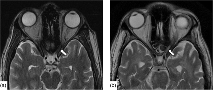 Figure 1: Axial T2W imaging demonstrated baseline (a) normal signal intensity of the canalicular segment of the optic nerves. Within 2 months, (b) there is new, notable signal hyperintensity in the optic nerves bilaterally.