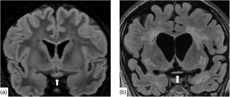 Figure 2: Coronal reconstruction of a volumetric Fluid-Attenuated Inversion Recovery (a) demonstrating normal signal and morphology of the optic chiasm. Contrast with 6 months after presentation (b) demonstrating severe atrophy of the chiasm and global volume loss. There is new severe white matter signal change in much of the imaged brain.