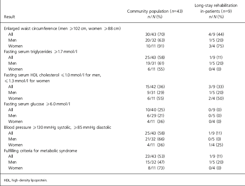 | Result | Community population (n=43) n/N (%) | Long-stay rehabilitation in-patients (n=9) n/N (%) |