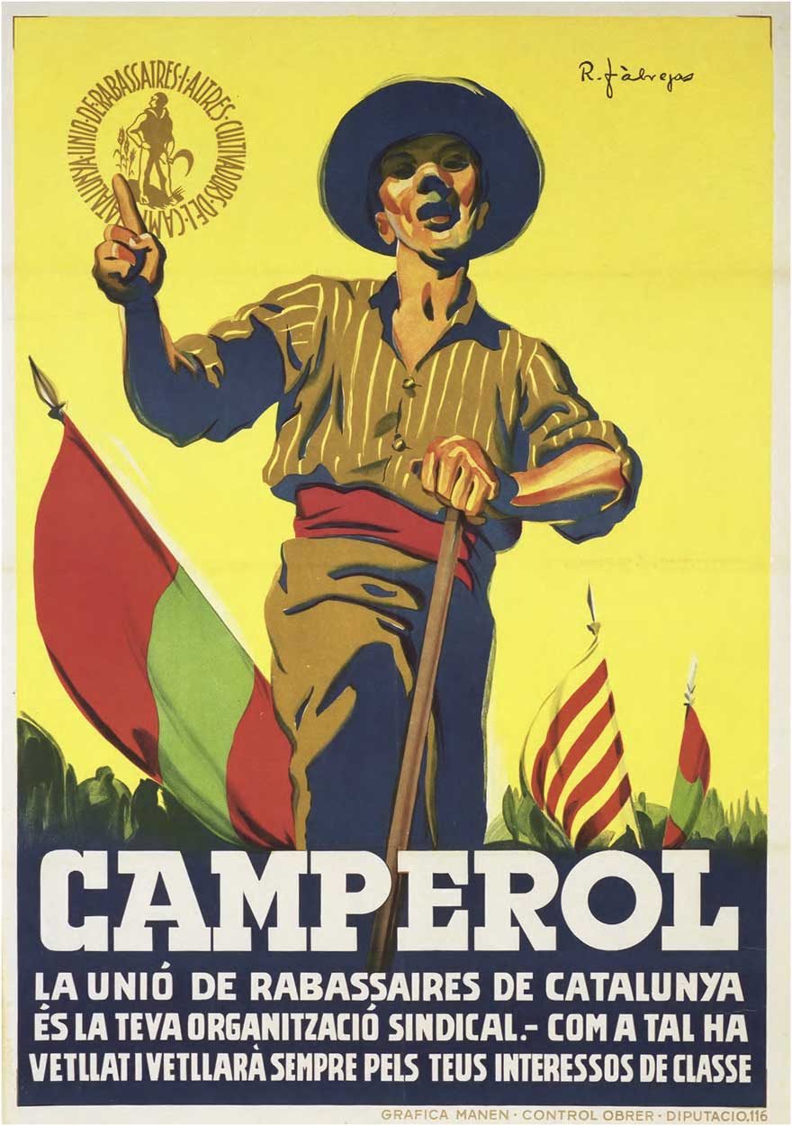 Figure 6 Poster for the Union of Rabassaires designed by Ricard Fàbregas during the Spanish Civil War (1936-1939). It reads: “Peasants. The Union of Rabassaires of Catalonia is your trade union organization. It has always defended your class interests and will continue to do so” Collection of Posters of the Spanish Civil War, Universitat de València. Biblioteca Històrica. Every effort has been made to accurately determine the rights holders of this image.