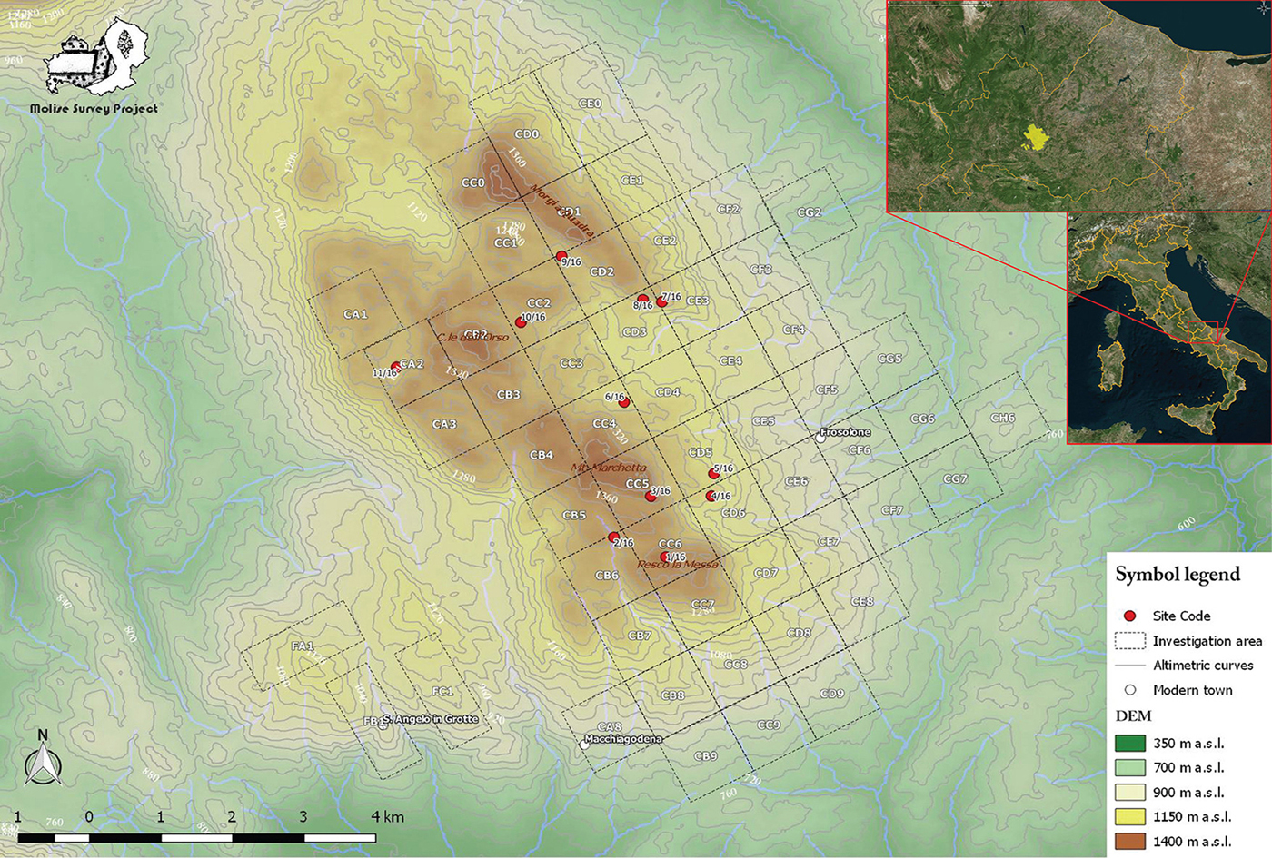 In 2016, the Molise Soprintendenza Archeologia, Belle Arti e Paesaggio (SABAP) granted a permit for the archaeological survey of a ~60km2 area that includes some of the highest mountains of the Molise region of southern Italy (Figure 1). Building on previous research (Barker Reference Barker1995; Minelli & Peretto Reference Minelli and Peretto2006), the main objective of the ‘Molise Survey Project’ is to investigate pre- and proto-historic human occupation of this upland area, with a particular focus on an ethnographical approach.