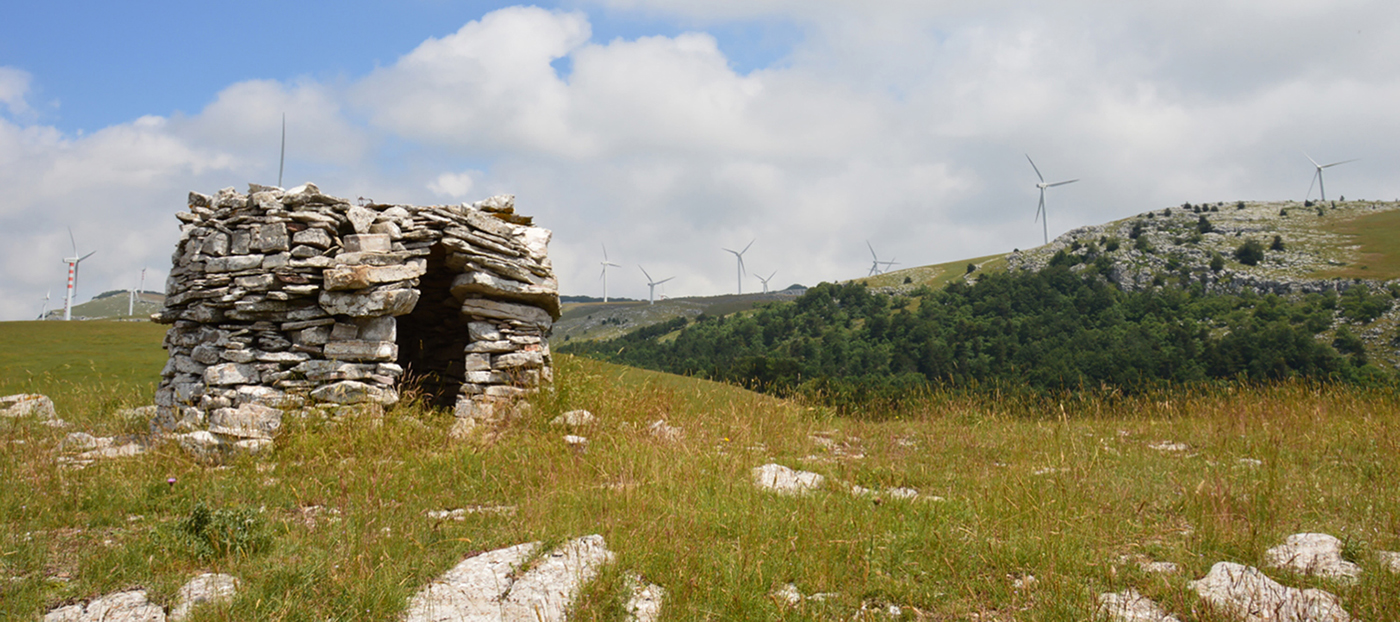 Located approximately 15km east of Isernia, this previously unstudied area is characterised by a pronounced physiography, with rocky spurs that reach 1400m asl, deep valleys and small lake basins subject to seasonal variation in water level (Figure 1). Mountain ridges, which represent the majority of the area under examination, are characterised by grassland vegetation; the mountain slopes are covered with woodland. Historically, the economic livelihoods of local communities were based on the exploitation of the available resources—water, grassland and agricultural soils—which were especially suited to transhumant pastoralism and the breeding of sheep, goat and cattle. Testimony to these pastoralist activities is found in the many stone structures, disused and ruined, scattered throughout the territory (Figure 2). Over the last 15 years, hundreds of wind turbines have been installed across the area, threatening the archaeological landscape.
